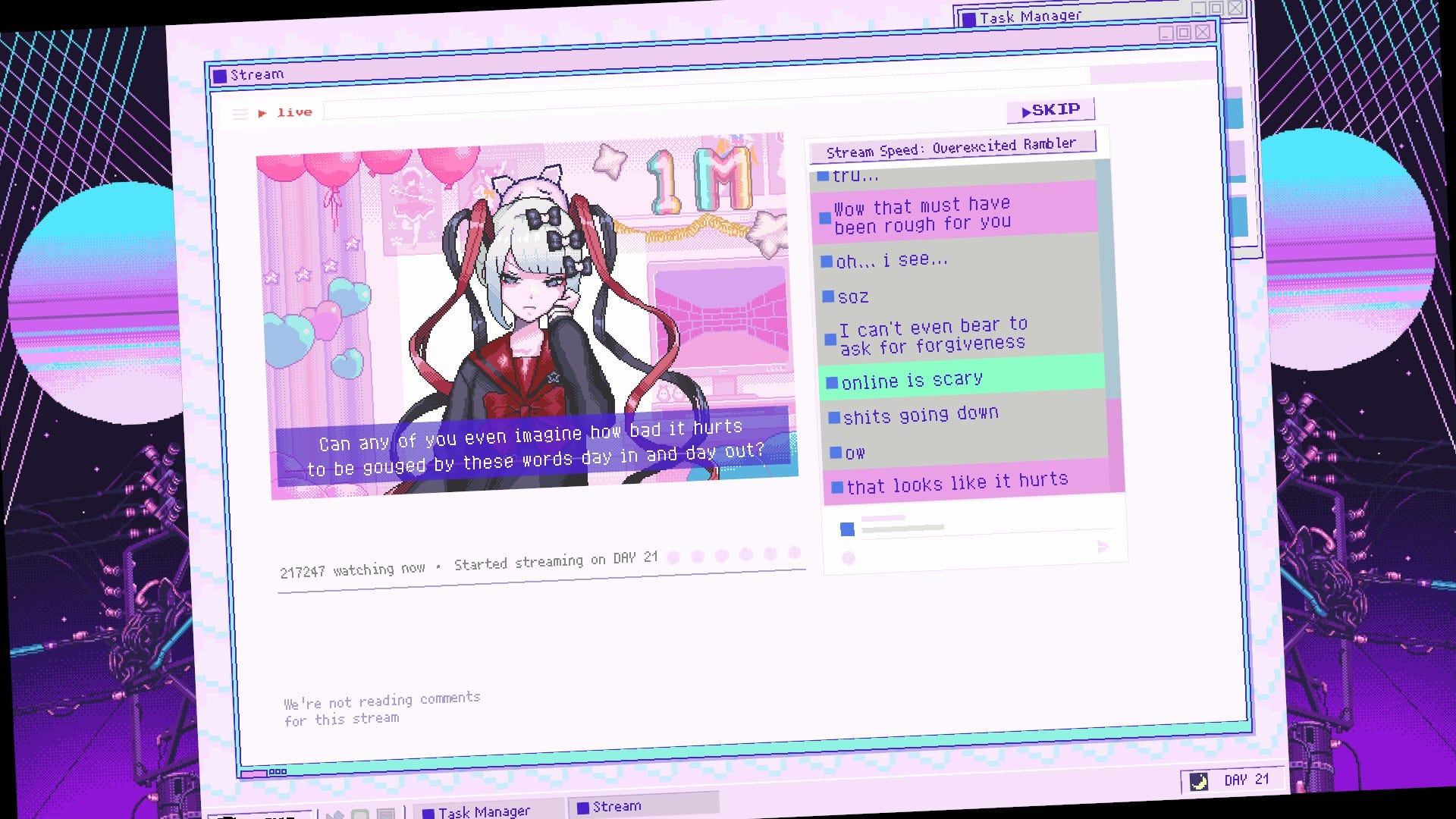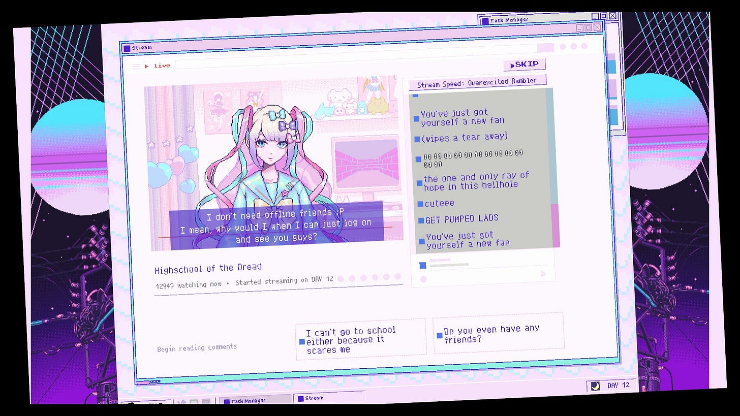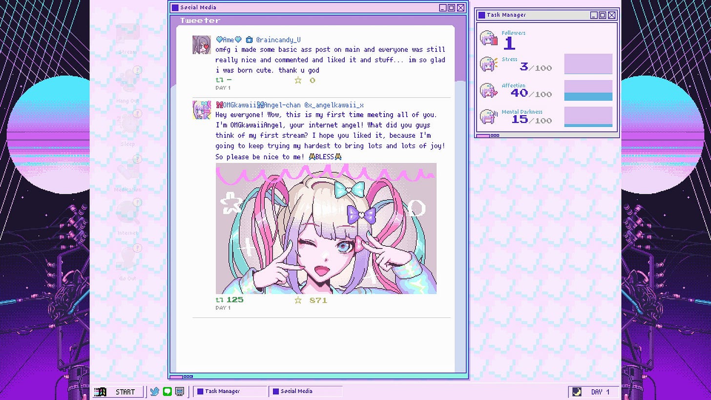 It’s not a game that attempts to slowly break you down or “come to realize the horrors of streaming” but more of an experimental scenario where you have to amass internet fame using methods people are likely already aware of and emphasizing the stress of being a fem streamer with an encroaching deadline of bills to pay and sustained growth. It’s a management sim with you playing as the only person running a self-employed business in the digital age and each part of your day connects back to working each night just before passing out to doing it again the next day regardless of if it’s a weekend or holiday.